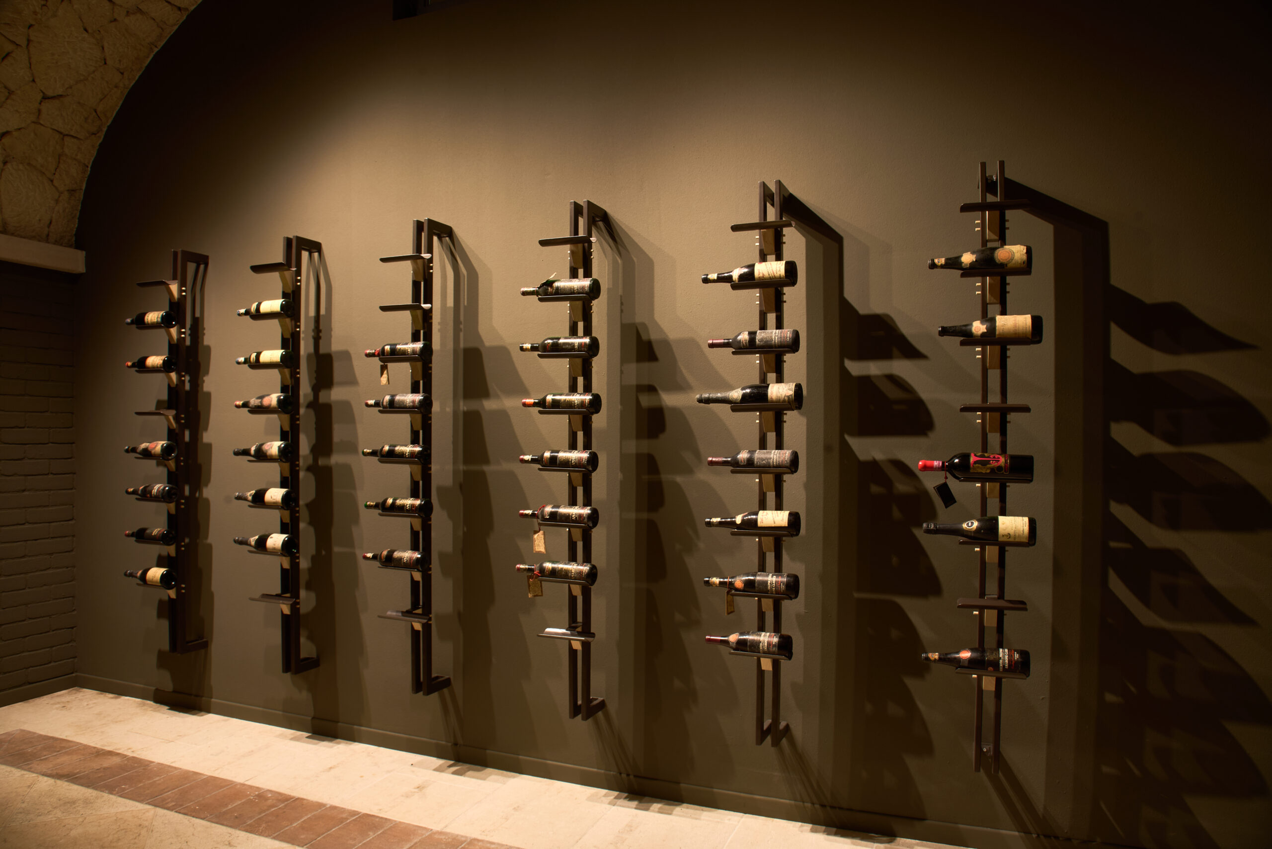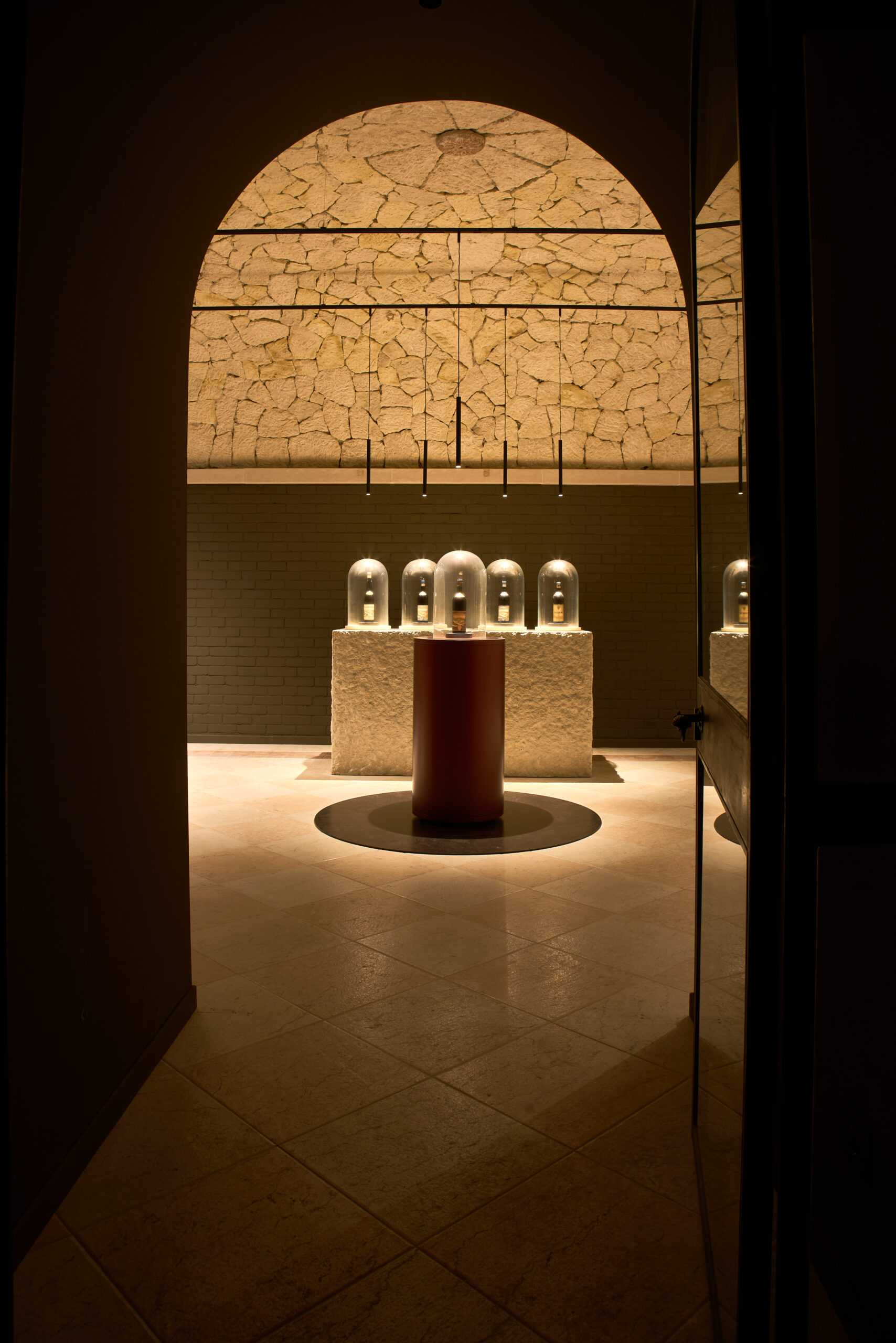 Già dall’ingresso, ripristinato ad arco come soglia verso un ambiente carico di memoria, il visitatore viene immerso in un’atmosfera essenziale e suggestiva. Le cinque bottiglie storiche – le quattro donate al Re d’Italia a inizio Novecento e la più antica bottiglia di Amarone della Valpolicella – sono le protagoniste assolute, esposte in teche di vetro che ne sottolineano unicità e valore.