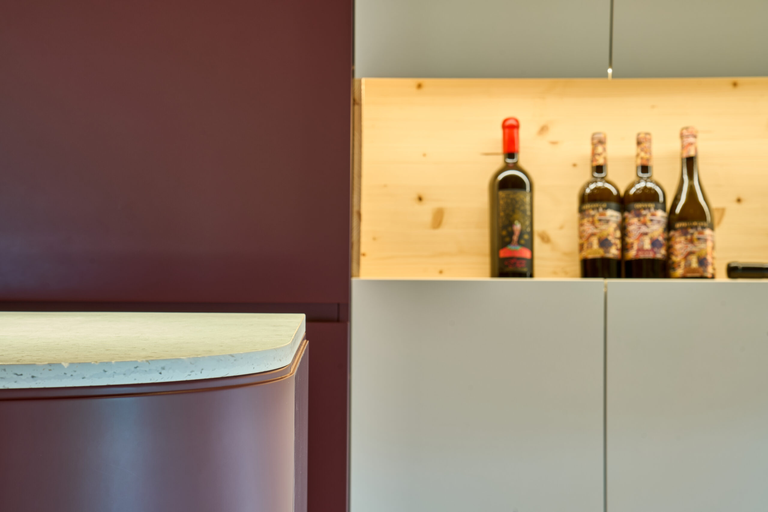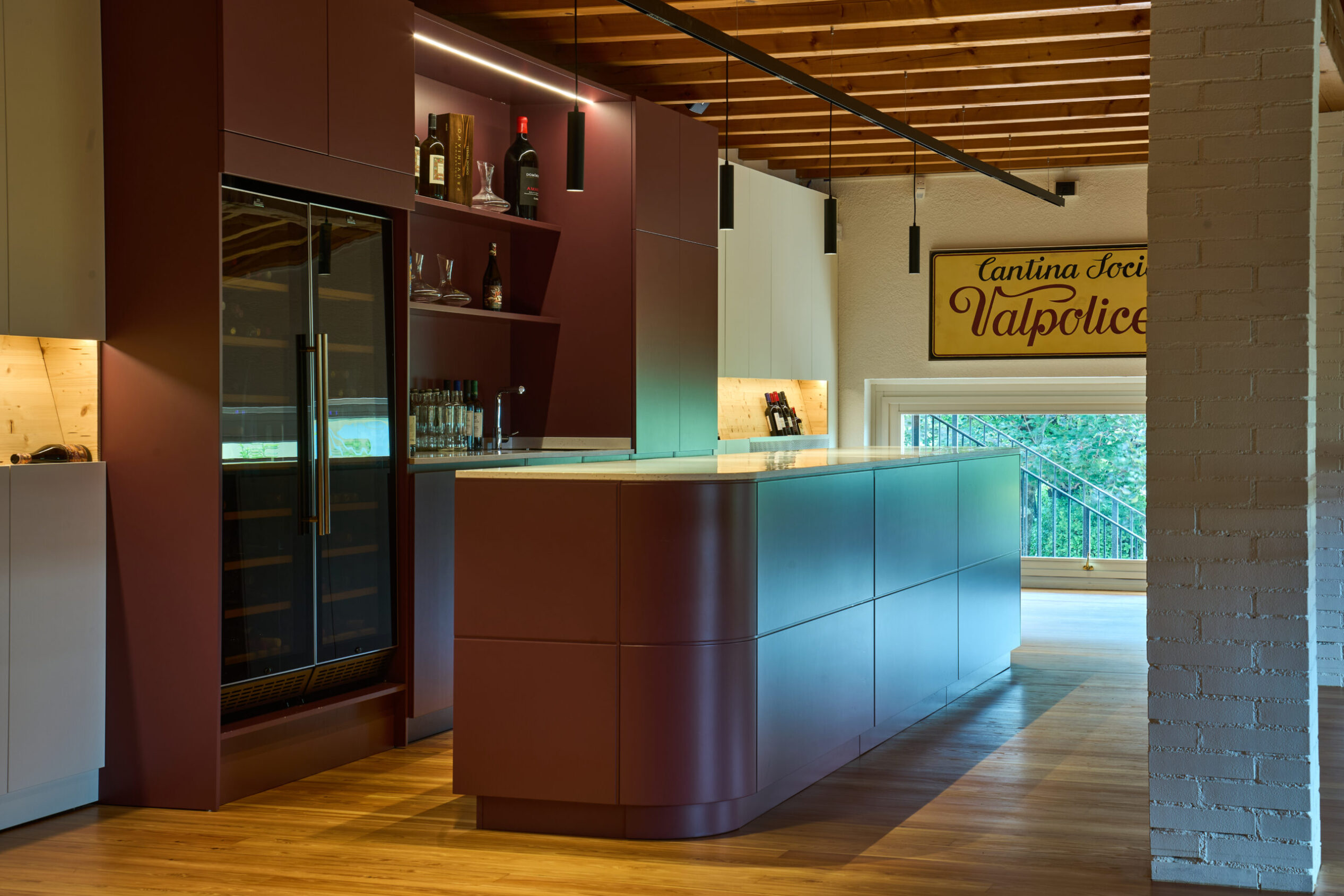 Il percorso prende avvio dalla Sala Domìni Veneti, cuore delle degustazioni, dove Reverse ha immaginato un ambiente contemporaneo e accogliente, capace di dialogare con la tradizione attraverso un linguaggio nuovo. Il colore vinaccia, scelto per i banconi e i vani frigo, diventa elemento connettivo tra i due livelli della sala, mentre le pareti attrezzate integrano vani di stoccaggio e una nicchia continua in legno naturale consente di esporre le bottiglie.