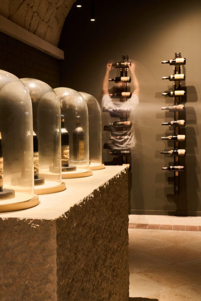 Già dall’ingresso, ripristinato ad arco come ponte verso questo ambiente ricco di storia, prende vita un percorso che unisce tradizione e design contemporaneo. Ogni dettaglio – dagli arredi alle luci, fino al colore delle pareti – è stato studiato per valorizzare al massimo l’esperienza. Entrando nel Caveau si è rapiti dalla presenza delle cinque bottiglie storiche protette da delle teche in vetro, che rappresentano le protagoniste indiscusse dello spazio. Le quattro bottiglie donate al Re d’Italia a inizio ‘900 sono state poste su un grande blocco in pietra chiuso con angolo a 45° per creare un effetto monoblocco e dentro cui, prima della chiusura finale, è stata riposta una bottiglia di Amarone firmata a celebrazione di questo momento. La quinta bottiglia, il più antico Amarone della Valpolicella, è stata posta invece su un piedistallo centrale di legno sorretto da una piattaforma di metallo. Per accogliere le restanti etichette è stato creato un grande espositore modulare in legno e metallo, progettato senza ferramenta: un sistema flessibile che permette di ricomporre lo spazio in base a nuove esigenze ed eventi.