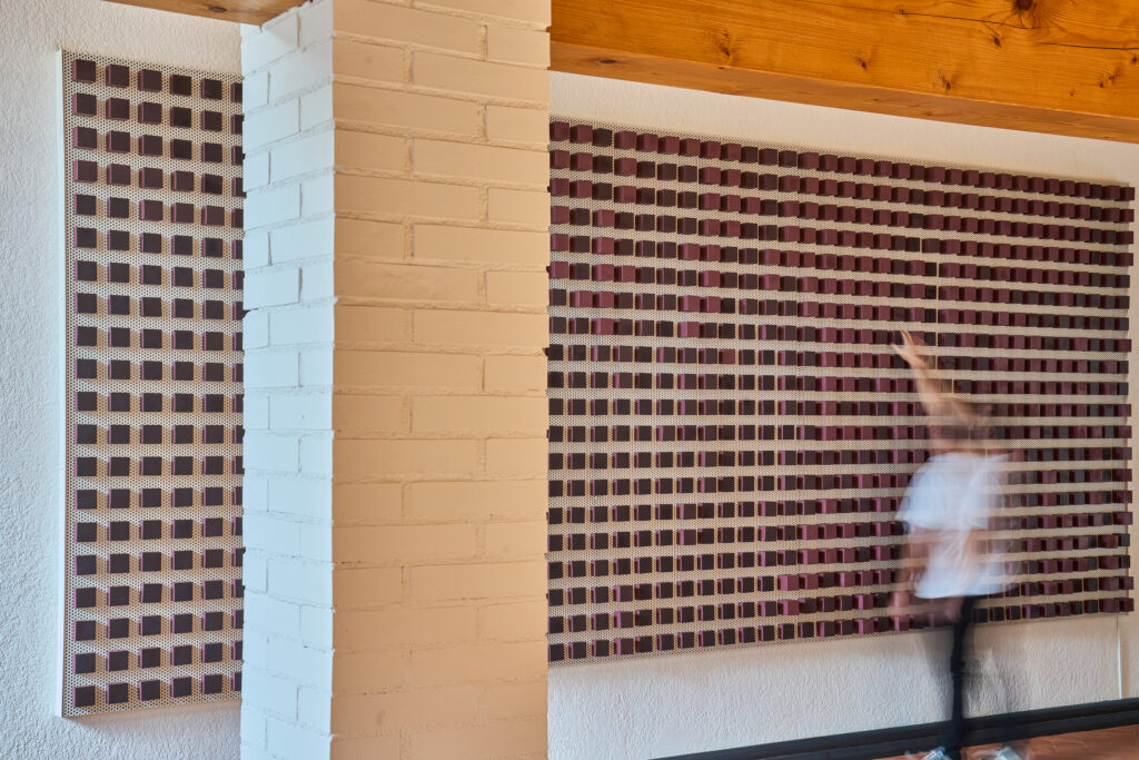 Il color vinaccia del bancone e dei vani frigo è l’elemento che unisce i due livelli della sala, mentre le pareti attrezzate ospitano diversi spazi di stoccaggio con ante e una mensola inclinata ad effetto nastro in legno naturale per ospitare le bottiglie. Sulla grande parete del piano terra un’opera retroilluminata incanta lo sguardo. In coordinamento cromatico con gli elementi allestitivi dello spazio, l’opera “Qui, non altrove” riproduce concettualmente le carte topografiche dove in questo caso è stata rappresentata l’area della Valpolicella, ma anche la dimensione collettiva che caratterizza la storia d’impresa della Cantina. 1000 cubi tagliati a mano dai nostri collaboratori detenuti rappresentano con le loro differenti altezze il terreno della Valpolicella, con i suoi particolari morfologici. Il linguaggio è sintetico, ma dal forte impatto evocativo ed estetico.